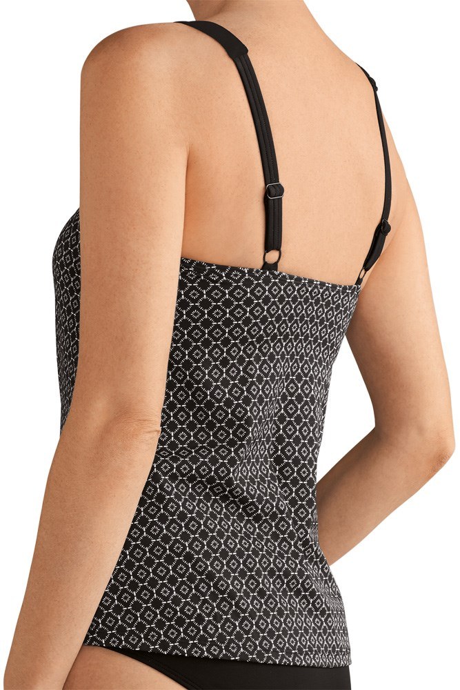The Ayon swimsuit group offers a style for every woman, no matter your shape. This Ayon Tankini top is an especially good fit if you're an O (fuller in the middle) or an A (narrow shoulders, wider hips) shape. The loose fit of the Ayon Tankini top falls comfortably over your tummy and swings a little as you move, with a subtle flare at the hemline. The Ayon group's geometric black and white all over print in front and back softens the look and is lovely paired with our black Ayon High Waist Brief or Board Shorts. Of course the pocketed bra cups are comfortable and hold your swim form securely in place.