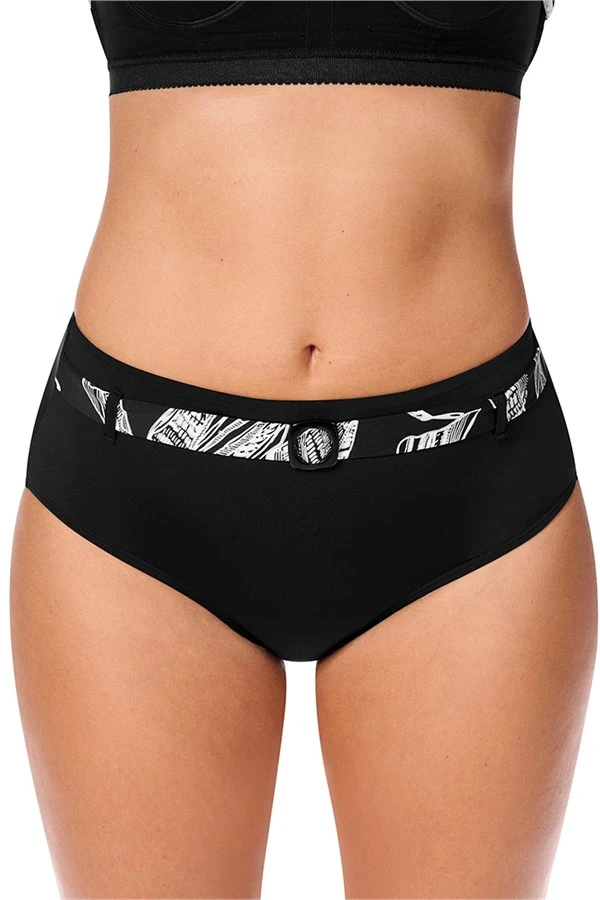 The Lanzarote High-Waist Brief combines elegant design with functional features to provide comfort and confidence. This solid colour high waist panty with belt in elegant leaf print with buckle-accessory out of plastic offers ideal coverage and durability for everyday wear.