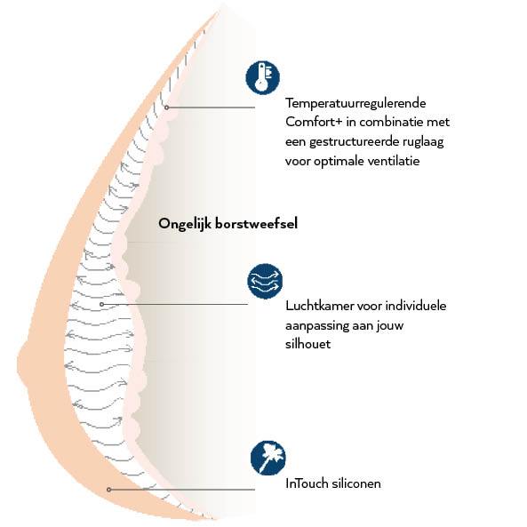 Ongelijke borsten... het is niet altijd een makkelijk onderwerp om over te praten. Maar bij veel vrouwen die borstkanker hebben meegemaakt, treden na verloop van tijd ongelijkheden in de borsten op. Borstasymmetrie begint vaak kort na het behandelings- en herstelproces. Het is niet alleen emotioneel belastend, maar kan ook leiden tot fysieke problemen wanneer de asymmetrie zeer uitgesproken is. In deze gevallen kan het verschil in gewicht mogelijk leiden tot een slechte houding, wat op zijn beurt kan leiden tot spanning in nek, schouders en rug.