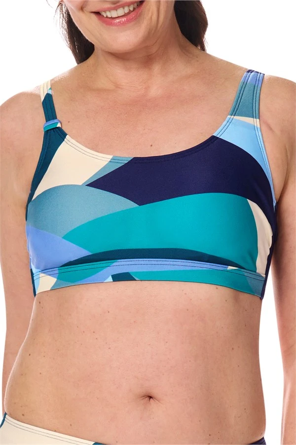 - Val op in de Lisbon bikinitop met levendig, abstract golfdesign in aquatinten, dat een stijlvolle twist geeft aan je strandlook