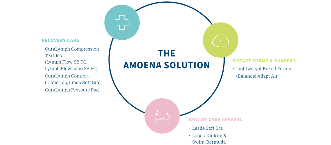 The Amoena Lymph Care Concept is ideal for patients after breast cancer therapy with mild lymphatic disease in the thoracic and/or chest area. Our care concept combines products from Recovery Care, Breast Care Apparel and Breast forms and shapers. Our product solutions complement each other excellently and make a contribution to holistic care