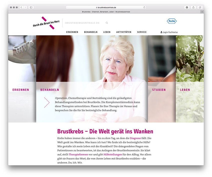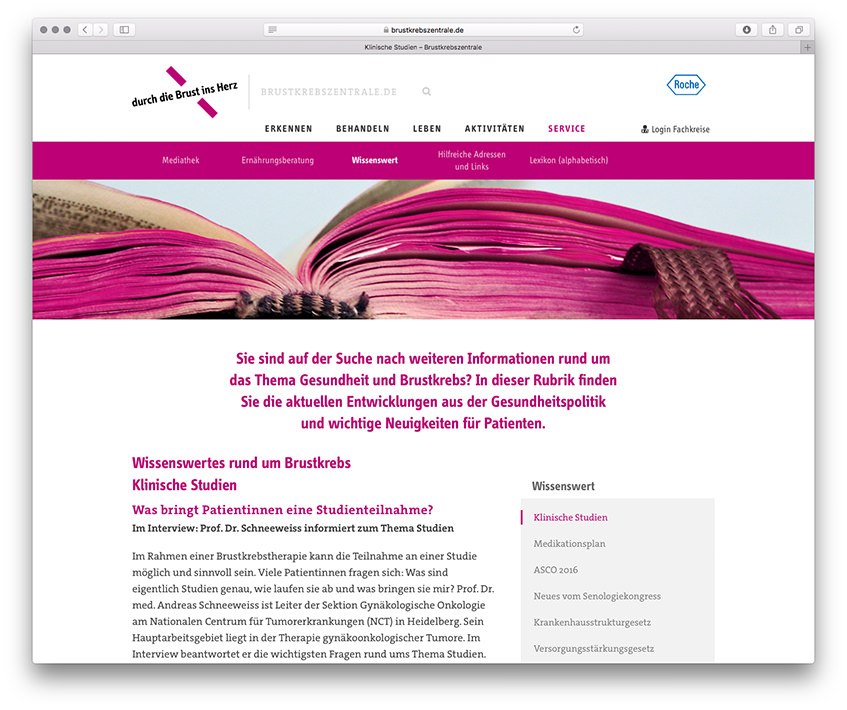 Bei Recherchen für einen Beitrag zum Thema Brustkrebs-Rezidiv stieß ich auf die Website der Brustkrebszentrale – und war erst einmal begeistert. Auf dem Informationsportal werden Erfahrungsberichte von Betroffenen, zahlreiche Experteninterviews sowie eine Reihe gut recherchierter und aufbereiteter Fachbeiträge angeboten – nicht nur in Textform, sondern auch als Video. Ich klicke durch die Website, lese, schaue mir die Artikel genauer an. Dann erst entdecke ich oben rechts das Logo von Roche Pharma.
