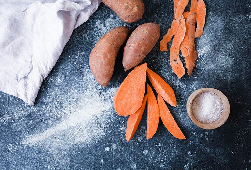 Den Ingwer und die Zwiebel schälen und fein würfeln. Die Süßkartoffeln schälen und grob würfeln. Olivenöl in einem großen Topf erhitzen, die Ingwer- und Zwiebelwürfel bei mittlerer Hitze darin andünsten. Nach drei Minuten die Süßkartoffelwürfel dazugeben und kurz mitdünsten. Anschließend mit der Gemüsebrühe auffüllen und ca. 20 Minuten köcheln lassen.