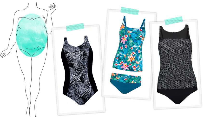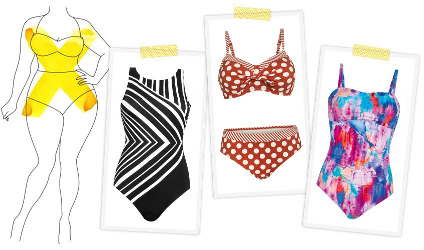 Welche Bademode passt? Einteiler strecken den Oberkörper optisch – ebenso wie Längsstreifen, dunkle Farben und leichte Raffungen an den Seiten, sogenannte Drapings. Eine gute Alternative zum Badeanzug ist auch der Tankini. Bei dem meist üppigen Busen empfiehlt sich außerdem ein Cup, der die Brust gut hält. Hierfür eignen sich Badeanzüge und Bikini-Tops mit breiten Trägern, Triangel- oder Neckholder-Oberteile sowie Bikinis mit Bügeln.