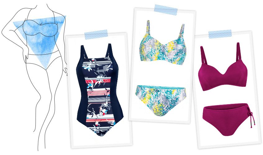 Welche Bademode passt? Das Oberteil sollte die weiblichen Formen unterstützen, insgesamt aber eher zurückhaltend wirken. Die Akzente setzt das Unterteil – mit Mustern, kräftigen Farben oder Rüschen. Bikinihosen, die man an der Seite bindet, lassen die meist schmale Hüfte etwas breiter wirken, ebenso wie Badekleider.