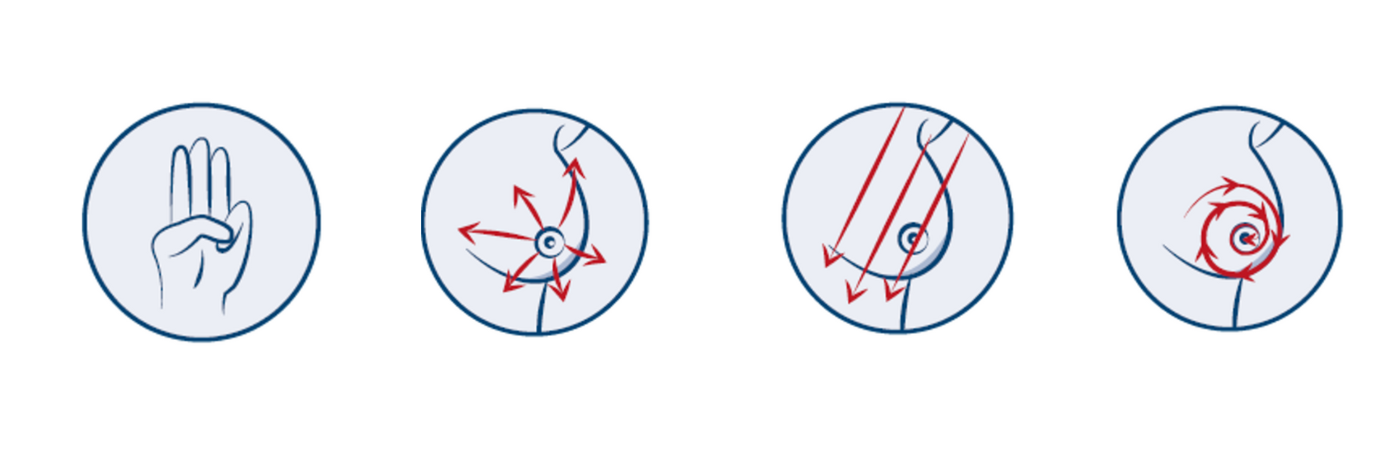 Gehen Sie möglichst systematisch vor, um keine Stelle zu vergessen. Untersuchen Sie die Brust strahlenförmig um die Brustwarze herum, in linearen Bewegungen von oben nach unten und von außen nach innen und in kreisförmigen Bewegungen von außen nach innen mit verschiedenen Druckstärken.