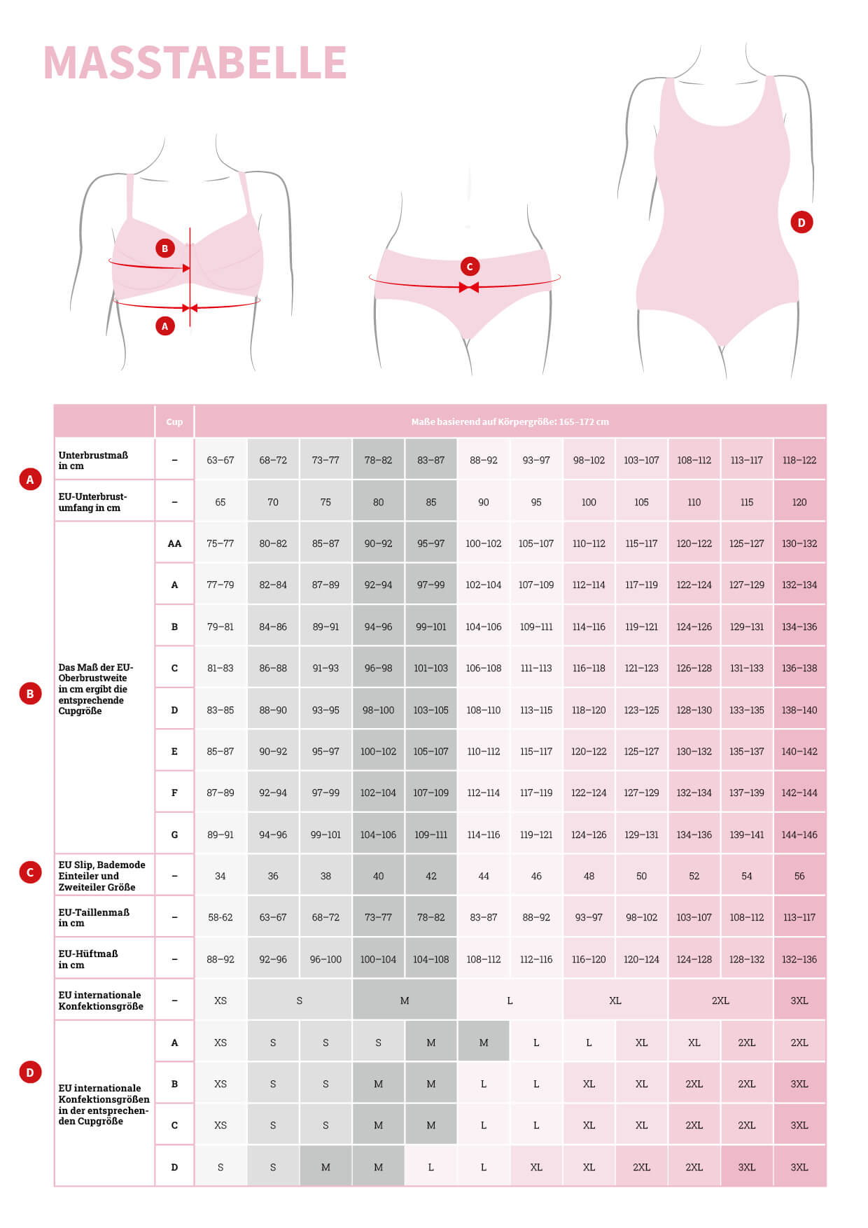 UnterbrustumfangMessen Sie den Brustumfang unterhalb der verbleibenden Brust, wo das BH-Band sitzt. Achten Sie darauf, dass das Maßband hinten etwas tiefer sitzt und eng anliegt. Mitte Ihrer Wirbelsäule (Abbildung A). |