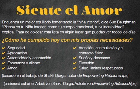 Sue asesora sobre como programar “tiempo para mí” al igual que una reunión regular. “Se trata de hacer un compromiso con una práctica regular de cuidado de uno mismo - incluso si es sólo cinco minutos al día,” comenta. “Esto te permite desarrollar y cultivar una de las relaciones más importantes en tu vida, la relación con uno mismo. Si damos prioridad a nuestras reservas de energía y sentimos amor por uno mismo, estamos en una posición mucho mejor para dar a los demás”.