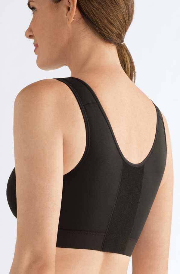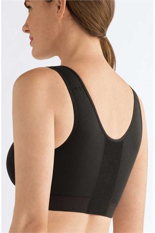 - Una pestaña con velcro, en el centro de la espalda permite unir de forma segura el Cinturón de Compresión Amoena a la prenda de compresión. Se puede cubrir la pestaña cuando no se precisa. El cinturón de Compresión se vende por separado.