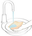 1. Reparta uniformemente en la superficie adhesiva (debe de estar seca) el Amoena Soft Cleanser.