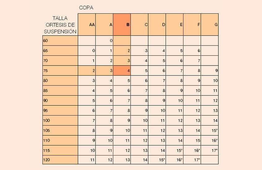 En el siguiente ejemplo puedes ver que la 75B corresponde a una prótesis de mama talla 4.