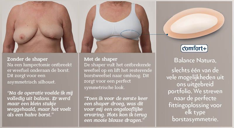De meerderheid van mijn cliënten die borstshapers dragen om ongelijke borsten in evenwicht te brengen - zo’n 20% van mijn cliënten - heeft een borstsparende operatie ondergaan of een borstamputatie met daaropvolgende borstreconstructie. Velen van hen vinden, na de reconstructie, dat hun borsten verschillend zijn qua grootte en zoeken een hulpmiddel om de asymmetrie te verhelpen. Borstimplantaten hebben niet de welvingen van een natuurlijke borst. Siliconenimplantaten zijn aan de voorkant namelijk vrij vlak en daardoor past de borst vaak niet goed in de behacup.
