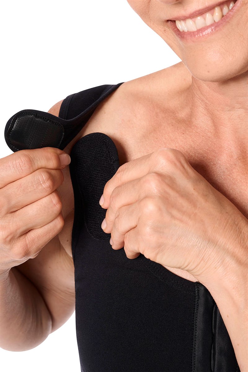 - Anatomisch gevormd met sterk, rekbaar materiaal voor een optimale pasvorm en compressie van de borst, ook op de cup, met bilaterale hoesjes voor uw borstprothese of shaper
