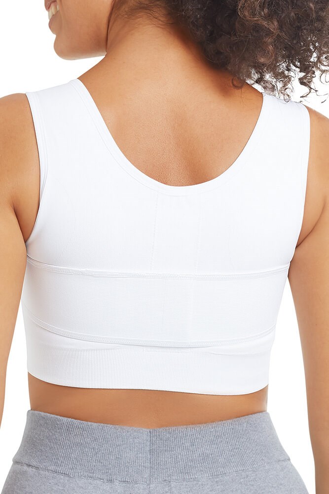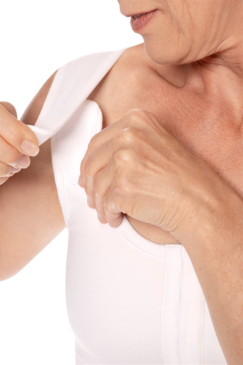 - Anatomisch gevormd met sterk, rekbaar materiaal voor een optimale pasvorm en compressie van de borst, ook op de cup, met bilaterale hoesjes voor uw borstprothese of shaper