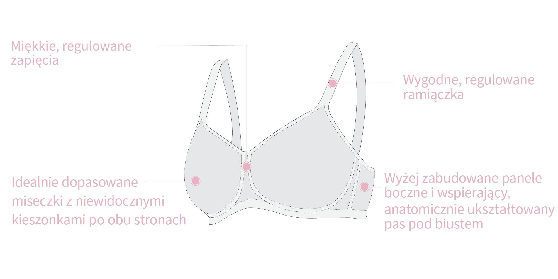 Dzięki specjalnemu krojowi i wyjątkowym właściwościom biustonoszy po mastektomii, kobiety które noszą protezę piersi, mogą czuć się pewniej i swobodnie. Dodatkowym atutem biustonosza po mastektomii są szerszy pas pod biustem i ramiączka, które zmniejszają ucisk na barki i szyję i korzystne wpływają na redukcję obrzęku limfatycznego.