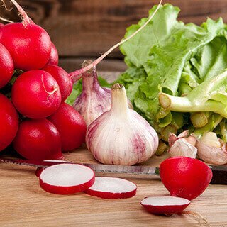 Skär av det gröna från rädisorna, skär det i mindre bitar och lägg åt sidan för tillfället. Dela rädisorna i fyra delar, blanda med 1 tsk salt, 1 tsk olivolja, salt o peppar. Sprid ut ett jämnt lager på bakplåten och rosta i 20-30 min eller tills det är mjuka och har fått lite färg.