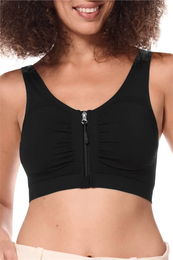 I ordered a 2nd Emila bra. Very comfortable & full coverage. But, it would nice to have a covering to slip the zipper into at the top, so it does not press against shirts, blouses, etc. & so shiny silver-color does not show.