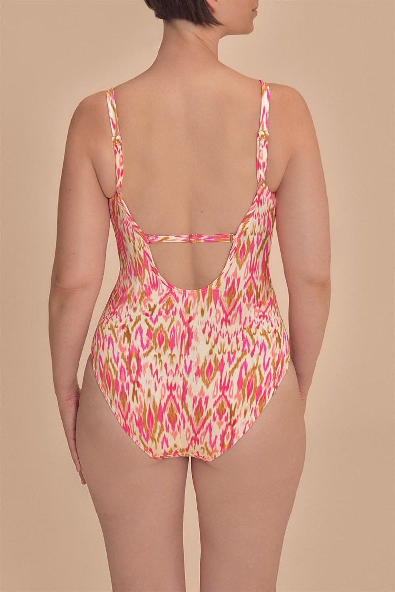 - Ikat-inspired print in pink and earth tones