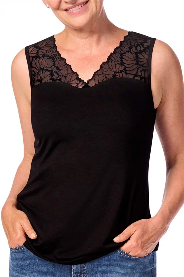 The Velvet Lace Top combines comfort and elegance, making it an excellent choice for women seeking both style and support. This feminine top with decorative velvet lace at the front neckline is the perfect look under your blazer, offering practical features designed for sensitive skin and prosthesis wearers.