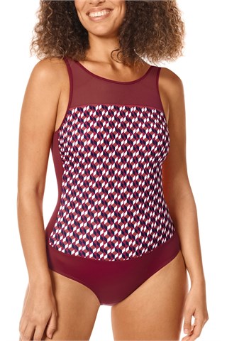 - The Apulia Half-Bodice High Neck Swimsuit brings habitat chic to life with a flattering burgundy retro design for a distinctive beachwear statement.