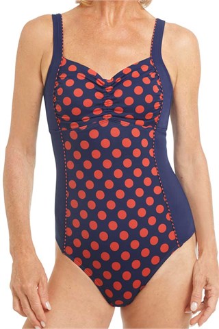 - Alabama Half-Bodice High Neckline Swimsuit in navy / rust; chic, modern and universally flattering